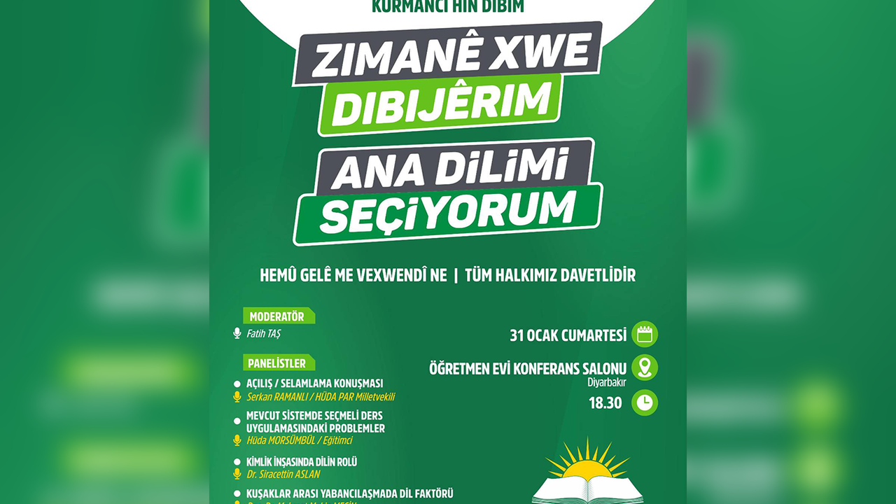 "Zimanê Xwe Dibijêrim / Ana Dilimi Seçiyorum" sloganıyla duyurulan panel, 31 Ocak Cumartesi günü merkez Yenişehir ilçesinde bulunan Diyarbakır Öğretmen Evi Konferans Salonu'nda saat 18.30'da gerçekleştirilecek.
