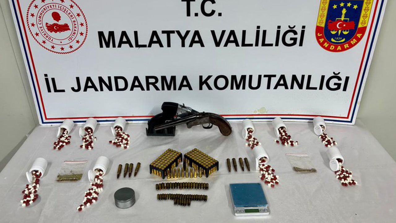 Narkotik Şube Müdürlüğü ile Battalgazi İlçe Jandarma Komutanlığı tarafından gerçekleştirilen operasyonda; 524 adet sentetik ecza hapı, 5 gram kubar esrar, 1 adet hassas terazi, 1 adet esrar öğütme aparatı, 2 adet 17 kalibre tabanca, 109 adet 38 milimetre fişek, 20 adet 7,65 milimetre fişek ve 29 adet 6,35 milimetre fişek ele geçirildi.
