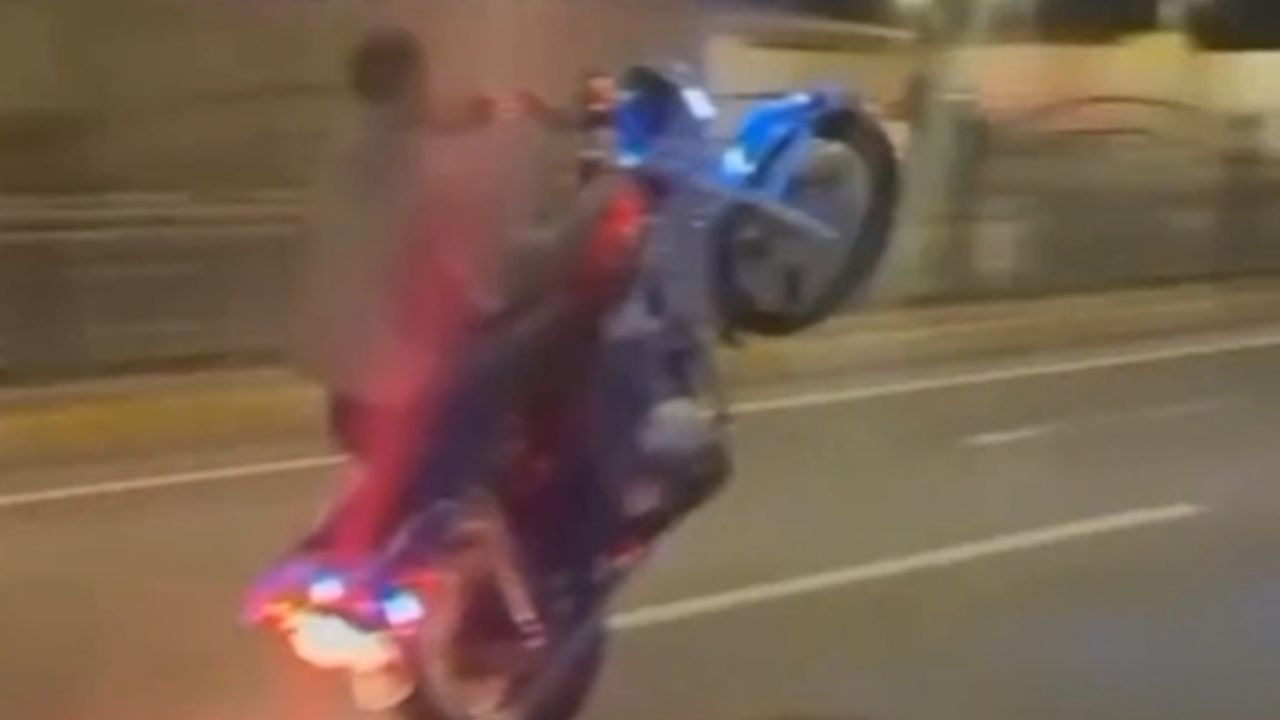 Paylaşılan görüntülerde bir gencin, caddede akan trafiğe aldırış etmeden motosikletin ön tekerini kaldırarak ilerlediği görülüyor. (İLKHA)