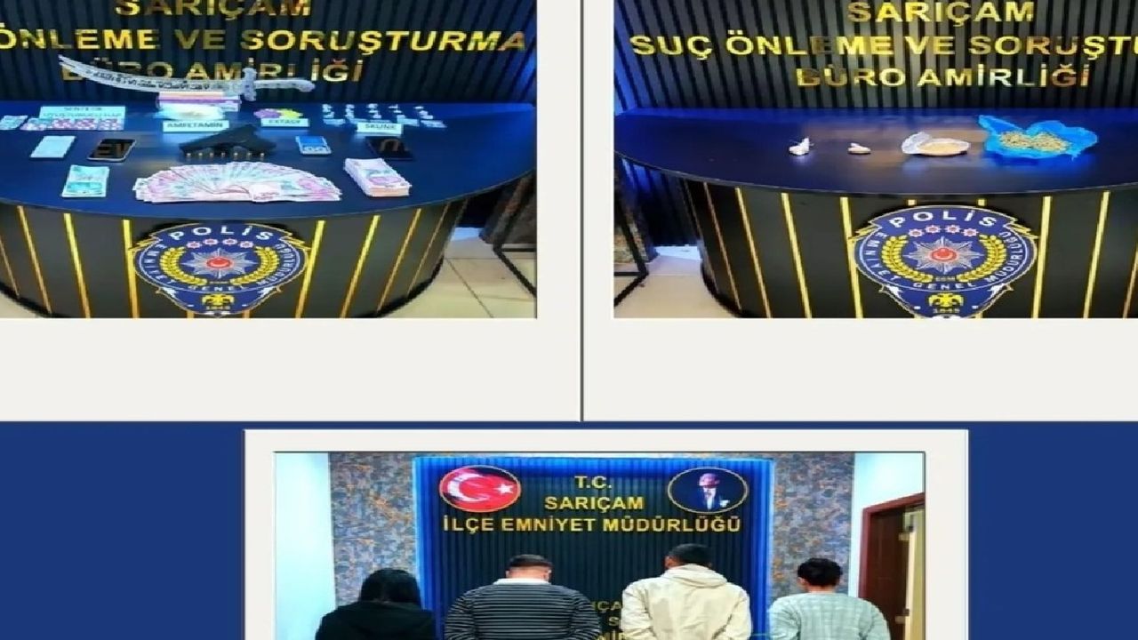 Sarıçam ilçesinde yapılan aramalarda 932,5 gram amfetamin, 58 gram esrar, 39,5 gram kannabinoid, 154 adet uyuşturucu hap, 15,5 gram skunk ele geçirildi. Operasyonlarda ayrıca 1 adet ruhsatsız tabanca, 1 adet şarjör, 7 adet fişek, 1 adet kılıç ve 1 adet hassas terazi bulundu.