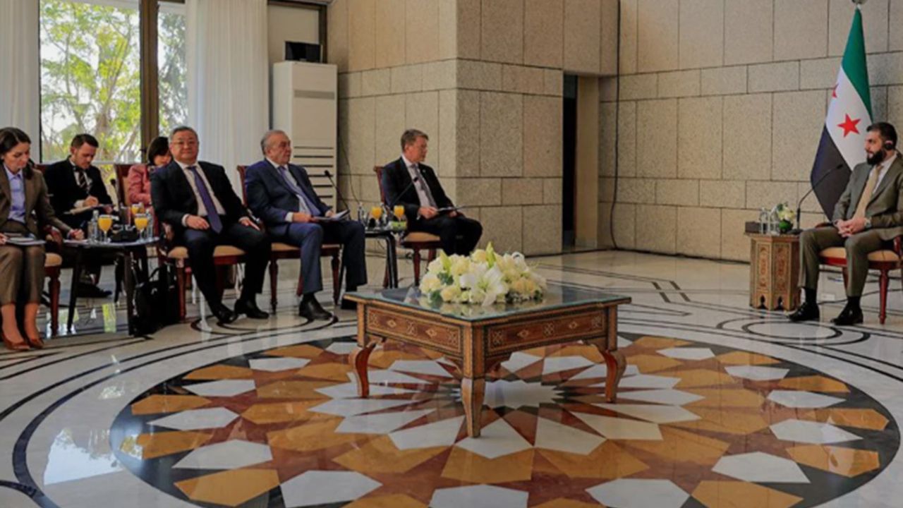 Suriye Cumhurbaşkanı Ahmed Şara, BMGK üyesi Çin, ABD, Rusya, İngiltere ve Fransa’nın da bulunduğu 15 ülkenin temsilcilerinden oluşan heyeti başkent Şam’daki Halk Sarayında kabul etti.