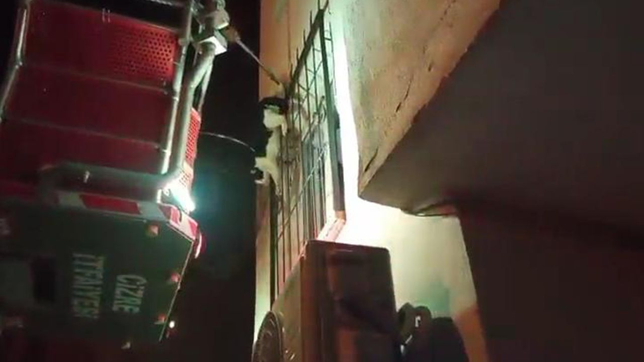 Cudi Mahallesi Konut Sokak üzerinde yaşanan olayda, bir binanın damından düşen kedi, pencerenin demir korkuluklarında ayağı sıkışarak asılı kaldı.