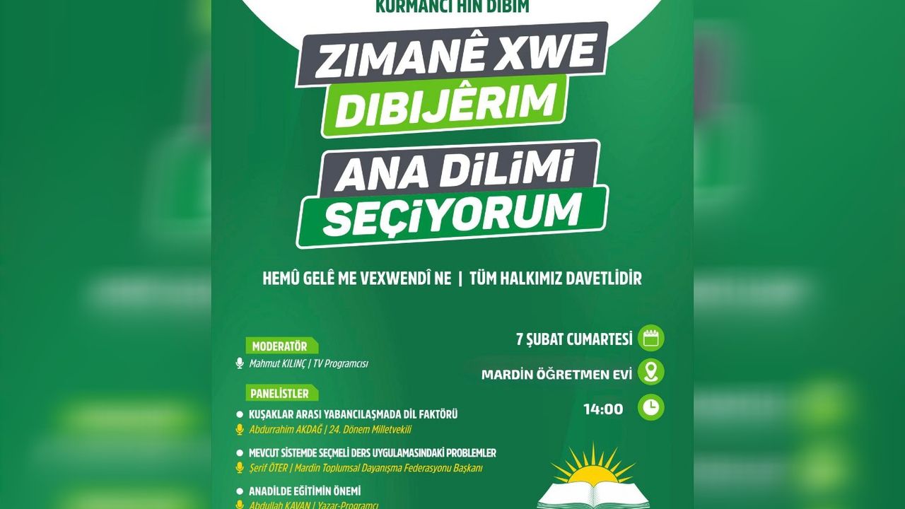 HÜDA PAR Eğitim İşleri Başkanlığı, "Ana Dilimi Seçiyorum" sloganıyla Mardin'de bir panel gerçekleştirecek. Mardin Öğretmen Evi'nde düzenlenecek olan panelde, ana dilde eğitimin önemi ve seçmeli ders sürecinde yaşanan aksaklıklar masaya yatırılacak. Panel, 7 Şubat Cumartesi günü saat 14.00'te Mardin Öğretmen Evi'nde gerçekleştirilecek.