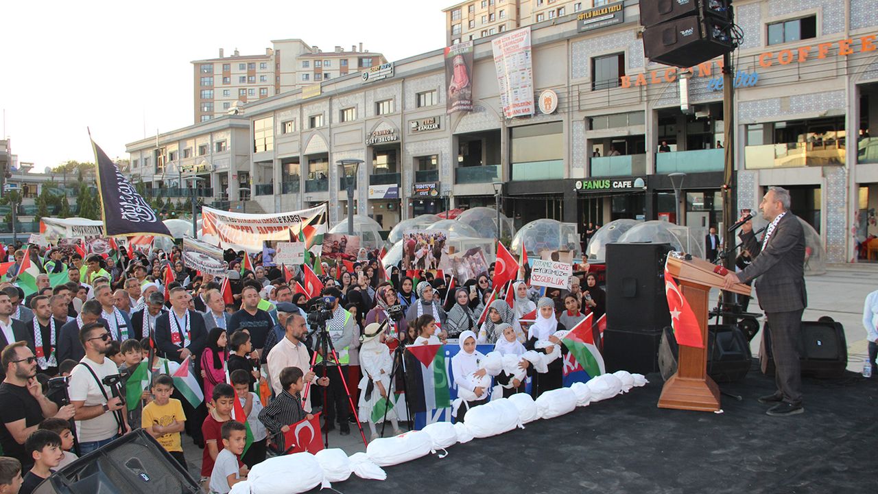Cumhuriyet Meydanı'nda kurulan alanda yürüyüş tamamlanırken, Kur'an-ı Kerim tilavetinin ardından platform adına açıklama yapan Abdullah Çatı, son 2 yılda işgalci rejimin Filistin halkına bombalar yağdırdığını, masum bebek, yaşlı demeden onları katlettiğini söyledi.