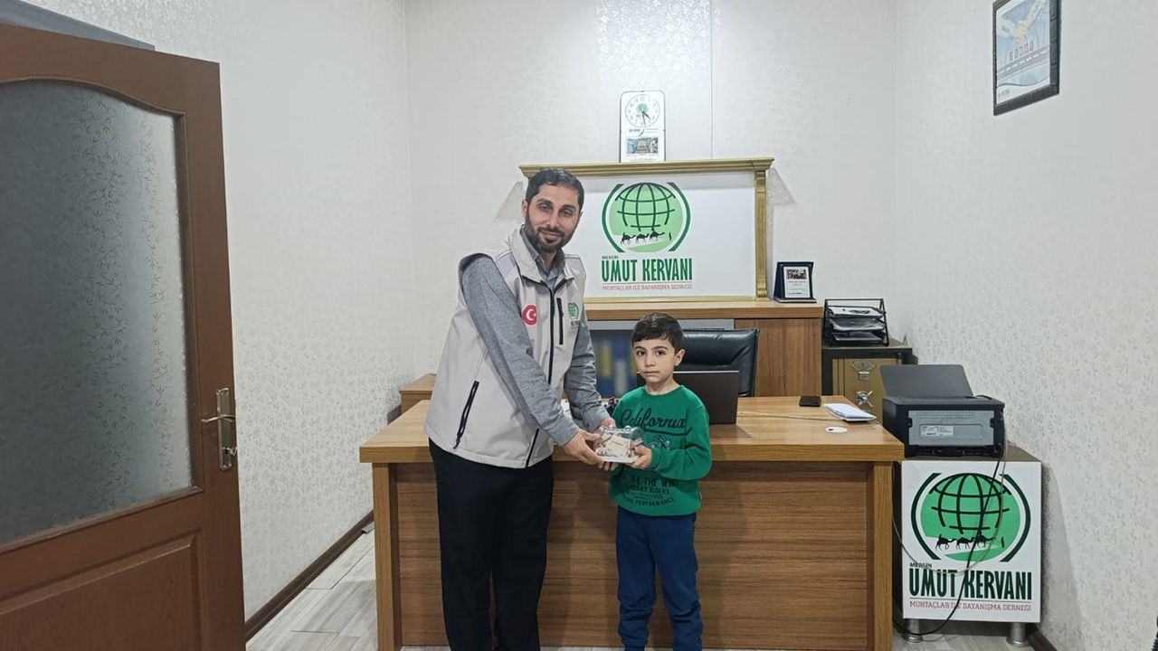 Umut Kervanı Mersin’e anlamlı bir bağışta bulunan Muhammed Taner, uzun süredir biriktirdiği paraları ve harçlıklarını Filistin halkına ulaştırılmak üzere teslim etti.
