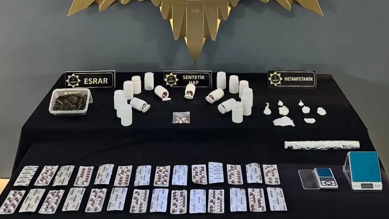 Operasyonda 1.340 adet sentetik ecza hap, 140 gram esrar, 48 gram metamfetamin ve 2 adet hassas terazi ele geçirildi.