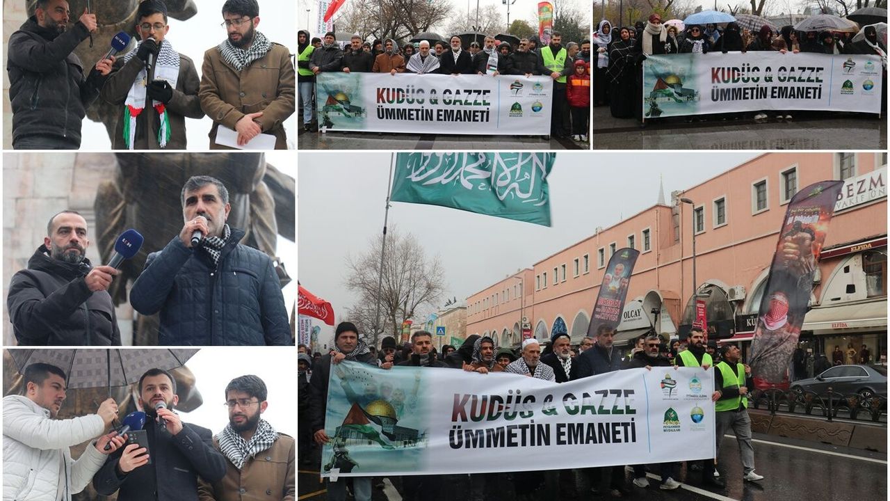 Soğuk hava ve kar yağışına rağmen Fatih Camii'nde öğle namazında bir araya gelen STK üye ve gönüllüleri, ellerinde tevhid bayrakları ile Saraçhane Parkı'na kadar sloganlar eşliğinde yürüdü.